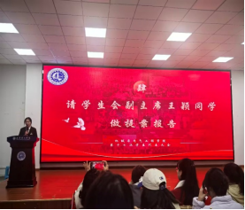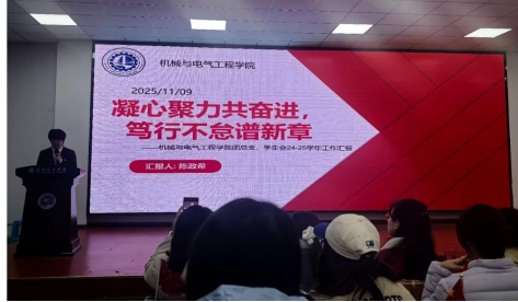 接着,学院学生会主席陈政希开展了学院2024-2025学年团总支、学生会工作汇报。报告以“凝心聚力共奋进、笃行不怠谱新篇”为主题,从四个方面为下一步工作锚定了坐标,指明了方向。第一是打造负责任、肯吃苦的骨干队伍,贯彻落实优良作风,构建严谨的制度体系;第二是打造学院品牌文化,对学生会同学们的优良作风借助新媒体宣传,加强思想引领作用;第三是营造积极向上的学风氛围,以获得省奖国奖为目标,鼓励参加威廉希尔,促进学生素质发展;第四是提升文明素养和综合素质,共同营造优秀宿舍文化、积累志愿实践经历等。最后,他以“未来属于奋斗者,青春属于追梦人”为报告画上了圆满的句号。