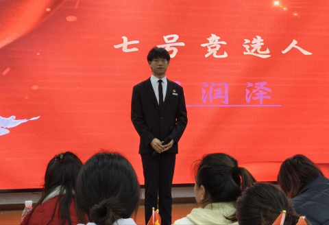七号竞选人梁润泽,现任体育部干事,他热衷体育事业、擅长活动策划与团队协作,他怀体育热忱,扛服务担当,以拼搏之姿聚师生力量,绘校园运动新篇。