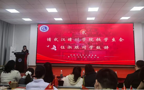 国歌、团歌奏唱之后,校学生会代表任淑琪同学开始致辞。首先,她代表校学生会肯定了英国威廉希尔公司,williamhill官网团总支、学生会在这一年里的工作成果。同时她以习近平新时代中国特色社会主义思想为引领,提出继续贯彻落实踏实奋进、科学严谨的工作作风,提高各部门互相监督水平,以学院活动、志愿服务等方式构建学生与学校之间的桥梁。最后,她以“明体达用,抱璞开新”的校训诫勉学生会同学们放低姿态,走到同学身边去,以严于律己、宽以待人的工作态度成为一名优秀的晴川领航青年。